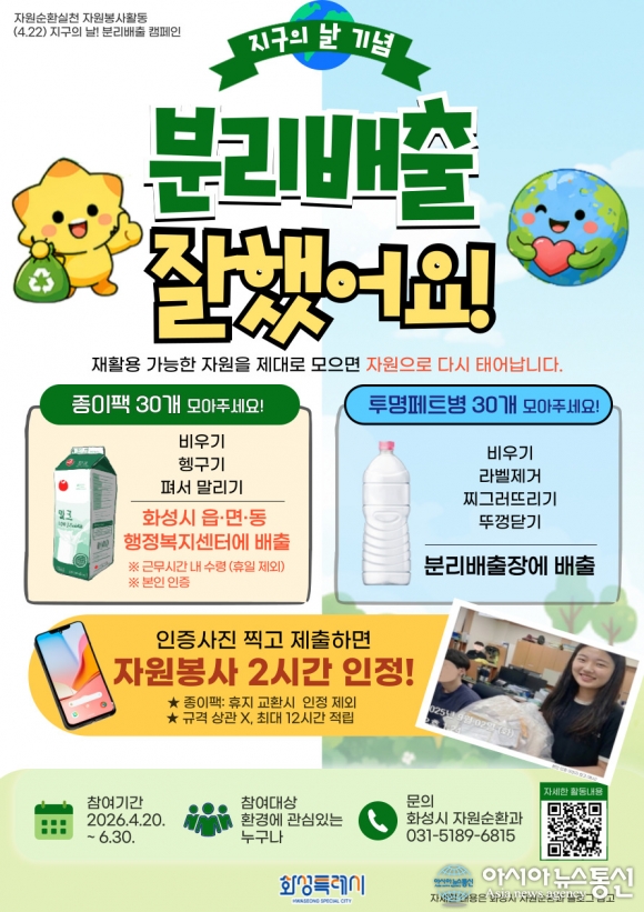 '분리배출 잘했어요!' 자원순환 실천 자원봉사 캠페인 포스터. [아시아뉴스통신=한기만 기자] 경기 화성특례시가 2026년 '지구의 날(4월 22일)'을 맞아 시민들이 일상 속에서 환경 보호를 실천할 수 있는 자원봉사 활동 '분리배출 잘했어요' 캠페인을 운영한다. 이번 활동은 지구의 날을 기념하는 일회성 행사를 넘어, 시민들이 재활용 자원의 가치를 인식하고 올바른 분리배출을 생활 습관으로 정착시키기 위해 마련됐다. 캠페인은 4월 20일부터 6월 30일까지 약 70일로 자원순환에 관심 있는 시민이라면 누구나 참여 가능하며 참여자에게는 '1365 자원봉사포털'을 통해 1일 최대 2시간, 기간 내 총 12시간의 봉사시간이 인정되는 혜택도 주어진다. 참여 방법은 종이팩이나 투명페트병을 각각 30개 이상 모아 올바른 방법으로 분리배출한 뒤 인증사진을 제출하면 된다. 특히, 이번 활동은 2026년 수도권 생활폐기물 직매립 금지 시행에 대응해 고품질 재활용 자원의 회수율을 높이고 쓰레기를 감량하는 실질적인 대책의 일환으로 추진된다. 이종원 자원순환과장은 "이번 활동은 지구의 날을 계기로 환경 실천을 일회성 행사가 아닌 생활 속 습관으로 전환하기 위한 것"이라며 "시민 누구나 쉽게 참여할 수 있는 만큼 적극적인 관심과 참여를 바란다"고 말했다. forzahkm@gmail.com
