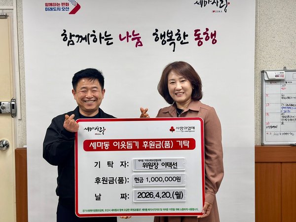 ▲ 오산시 세마동, 지역사회보장협의체 위원장 후원성금 100만원 기탁…3년 연속 나눔 실천 오산시는 세마동 행정복지센터를 통해 지난 20일 세마동 지역사회보장협의체 이택선 위원장이 어려운 이웃을 위한 후원성금 100만원을 기탁했다고 밝혔다. 세마동 행정복지센터에 따르면 이택선 위원장은 3년 연속 후원 성금을 전달하며 지역사회 나눔 문화 확산에 앞장서고 있다. 이번에 기탁된 성금은 관내 저소득층과 복지사각지대에 놓인 취약계층 지원에 사용될 예정이다. 특히 이번 기탁은 단발성 지원에 그치지 않고 3년째 꾸준히 이어지고 있다는 점에서 의미를 더하고 있다. 시는 이러한 지속적인 나눔 실천이 지역사회 내 따뜻한 기부 문화 확산의 모범사례가 되고 있다고 평가했다. 유미정 세마동장은 “매년 잊지 않고 따뜻한 나눔을 실천해주시는 이택선 위원장님께 깊이 감사드린다”며 “기탁해주신 성금은 도움이 필요한 이웃들에게 소중히 전달하겠다”고 말했다. 이택선 위원장은 “나눔은 거창한 것이 아니라 주변 이웃을 한 번 더 돌아보는 작은 관심에서 시작된다고 생각한다”며 “일회성이 아닌 지속적인 마음이 지역사회에 조금이나마 따뜻한 온기로 전해지길 바란다”고 전했다. [아시아뉴스통신=양종식 기자] didwhdtlr7848@daum.net