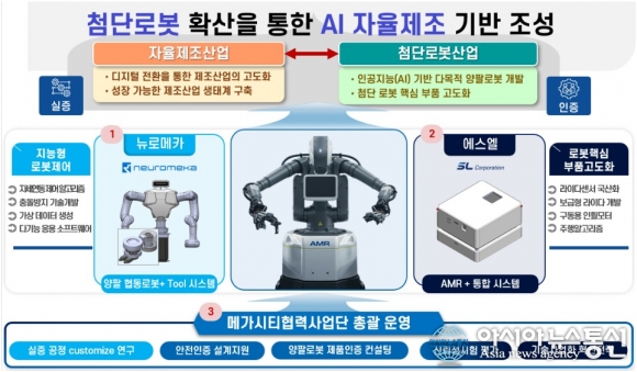 첨단로봇 확산을 통한 AI 자율제조 기반 조성.(자료제공=대구시청) [아시아뉴스통신=윤석원 기자] 대구광역시는 국내 최초로 지역 기업의 실제 제조 현장에서 '이동형 양팔 로봇' 실증을 본격적으로 시작한다. 이동형 양팔 로봇은 자율주행이동체(AMR) 위에 양팔 협동 로봇이 결합된 형태의 로봇을 말한다. 이번 사업은 대구시가 지난해 4월 선정된 산업통상부(전담기관 한국산업기술진흥원) '메가시티협력 첨단산업 육성지원(R&D) 사업'의 핵심 성과로, 이동형 양팔 협동 로봇이 연구실을 벗어나 실제 산업 현장에서 임무를 수행하는 국내 첫 사례다. 해당 로봇은 대구기계부품연구원이 총괄하고 ㈜에스엘과 ㈜뉴로메카가 공동 개발 중이다. 기존 단일 팔 또는 고정형 로봇과 달리, 휴머노이드 로봇 기술의 핵심인 '양팔 협업' 기능을 갖춰 제조 현장에서 사람과 함께 안전하게 공정을 수행할 수 있도록 설계됐다. 실증은 23일부터 지역 대표 자동차 부품기업 에스엘의 생산공정에서 진행된다. 기판 외형가공(PCB Routing) 공정에 투입된 로봇은 작업물 이송부터 장비 안착, 부산물 분리배출, 완제품 보관까지 전 과정을 수행하며 공정 효율성과 생산성 향상을 이끌 예정이다. 이번 실증은 에스엘이 대구시가 추진한 '이동식 협동로봇 규제자유특구(2020~2024)' 사업에 참여하며 축적한 경험을 바탕으로, 뉴로메카와 협력해 기술을 고도화한 결과다. 이는 제조 기업이 로봇 기술 기업으로 확장할 수 있음을 보여주는 사례로, 지역 제조업의 고도화와 산업 전환 가능성을 시사한다. 대구시는 이번 실증을 계기로 핵심부품 개발부터 완제품 생산·실증까지 이어지는 완결형 로봇산업 생태계를 구축해 'AI 첨단로봇 수도'로 도약한다는 구상이다. 현재 대구시는 '휴머노이드 로봇 국가첨단전략산업 특화단지' 지정도 추진하는 등 로봇산업을 미래 핵심 성장동력으로 육성하기 위해 정책 역량을 집중하고 있다. 정의관 대구시 미래혁신성장실장은 "이번 실증을 통해 이동형 양팔 로봇을 성공적으로 현장에 안착시키는 기반을 마련하고, 대구가 대한민국 로봇산업의 중심지로서 신산업 생태계를 확장시켜 지역 경제에 새로운 활력을 불어넣을 수 있을 것"이라고 말했다. seok193@daum.net
