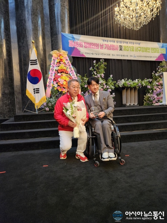 이한영 대전시의회 의원(국민의힘, 서구6)이 지난 17일 열린 제46회 장애인의 날 기념행사에서 장애인 권익 증진과 복지 향상에 기여한 공로를 인정받아 감사패를 수상했다./사진제공=/이한영 시의원 [아시아뉴스통신=박희석 기자] 이한영 대전시의회 의원(국민의힘, 서구6)이 지난 17일 열린 제46회 장애인의 날 기념행사에서 장애인 권익 증진과 복지 향상에 기여한 공로를 인정받아 감사패를 수상했다고 19일 밝혔다. 이번 감사패는 대전시지체장애인협회서구지회가 수여한 것으로 이 의원의 지속적인 관심과 지원, 장애인 정책 개선을 위한 적극적인 의정활동을 높이 평가된 데 따른 것이다. 이한영 대전시의원은 평소 장애인의 목소리와 현장의 의견을 정책에 반영하기 위해 간담회와 현장 방문을 이어오며 실질적인 변화를 이끌어왔다. 특히 ‘대전시교육청 장애인 고용촉진 조례안’을 대표 발의하는 등 공공부문 장애인 일자리 확대와 고용 환경 개선을 위한 제도적 기반을 마련했다. 권준석 지회장은 “이한영 의원은 지역 장애인들의 어려움에 귀 기울이며 실질적인 변화를 이끌어온 인물”이라며 “앞으로도 장애인 복지 향상을 위한 역할을 기대한다”고 밝혔다. 이한영 대전시의원은 수상 소감에서 “뜻깊은 상을 받게 되어 매우 영광스럽다”며 “앞으로도 장애인과 비장애인이 함께 어우러지는 사회를 만들기 위해 더욱 책임감을 가지고 의정활동에 임하겠다”고 말했다. 이날 기념행사에는 지역 장애인과 관계자들이 참석해 장애인의 날을 함께 기념하고, 장애인 인식 개선과 권익 증진의 의미를 되새기는 시간을 가졌다. news26@hanmail.net