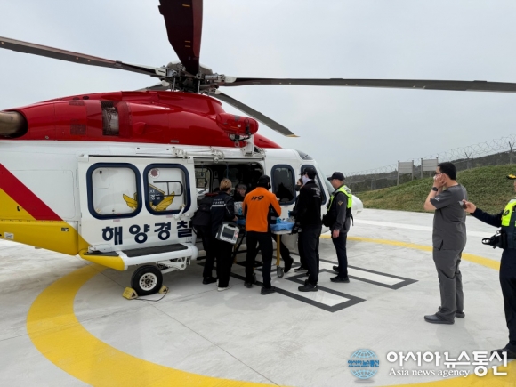 인천 소재 병원으로 이송하기 위해 환자를 인수 중인 해양경찰관./사진제공=중부지방해양경찰청 [아시아뉴스통신=조은애 기자] 중부지방해양경찰청(청장 박재화)은 21일 인천 연평도에서 발생한 응급환자를 헬기로 인천 소재 대형병원으로 긴급 이송했다고 밝혔다. 중부해경청은 이날 11시 37분경 연평도에서 흉통을 호소하는 환자가 발생했다는 신고를 접수하고, 즉시 구조헬기를 현장으로 급파했다. 13시 09분경 연평도 헬기장에 도착한 중부해경청 소속 회전익 항공대는 환자 1명을 인계받아 이송을 시작했으며, 13시 54분경 인천 소재 병원에 안전하게 이송을 완료했다. 환자 A씨(40대, 여)는 이날 새벽부터 흉통을 호소해 연평도 내 의료진의 진료를 받은 결과, 심장 질환이 의심되어 대형병원 이송이 필요하다는 판단에 따라 긴급 이송이 요청된 것으로 알려졌다. 현재 A씨는 병원에서 치료를 받고 있다. 중부해경청 관계자는 “도서 지역 응급환자의 골든타임 확보를 위해 항공기를 적극 활용하고 있다”며 “앞으로도 국민의 생명 보호를 최우선으로 신속한 구조 활동에 최선을 다하겠다”고 밝혔다.