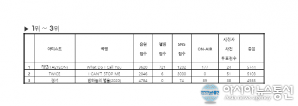 2위는 트와이스의 'I CAN`T STOP ME', 3위는 경서의 '밤하늘의 별을(2020)'이 차지했다.