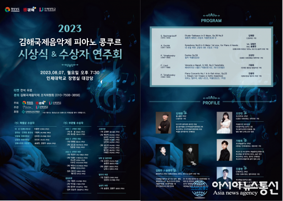 ‘2023 김해국제음악제 피아노콩쿠르 시상식 및 수상자 연주회’는 8월 7일 오후 7시 30분 인제대학교 장영실관 대강당에서 개최된다. 앞서 6월 10일 개최된 김해국제음악제 피아노콩쿠르에서 수상한 6팀이 이번 무대에 오른다.