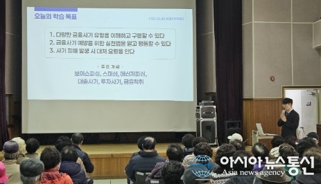[아시아뉴스통신=장희연 기자] 경상남도는 금융감독원 경남지원과 협력해 고령층 등 취약계층 대상으로 보이스피싱을 비롯한 불법금융 피해 예방 교육을 실시한다고 밝혔다.