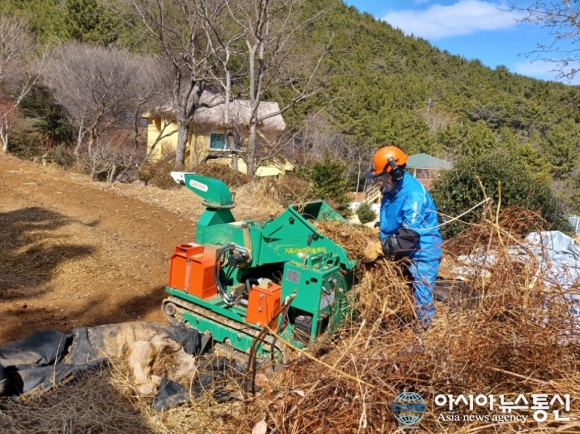 ‘영농부산물 안전처리 지원사업’을 통해 과수 잔가지, 고춧대, 깻대 등 영농부산물을 무료로 파쇄 처리해 농가의 처리 부담을 줄이고, 불법소각으로 인한 산불 위험 방지 및 미세먼지 발생 저감을 위해 노력하고 있다.
