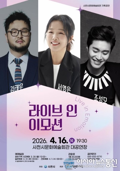 [아시아뉴스통신=장희연 기자] 사천문화재단이 운영하는 사천시문화예술회관이 오는 4월 감성 라이브 콘서트 ‘라이브 인 이모션(Live in Emotion)’을 선보이며 시민들에게 특별한 음악적 감동을 선사한다.